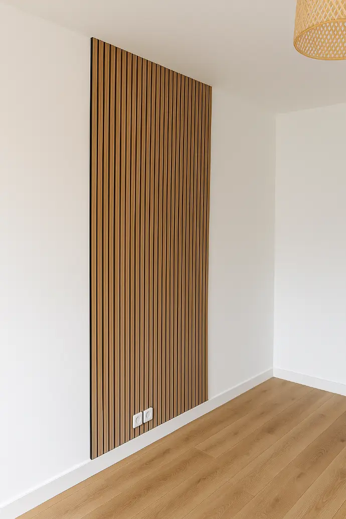 Alliez sobriété et élégance avec une peinture murale soignée et des lames décoratives en bois, pour un intérieur moderne, design et raffiné.