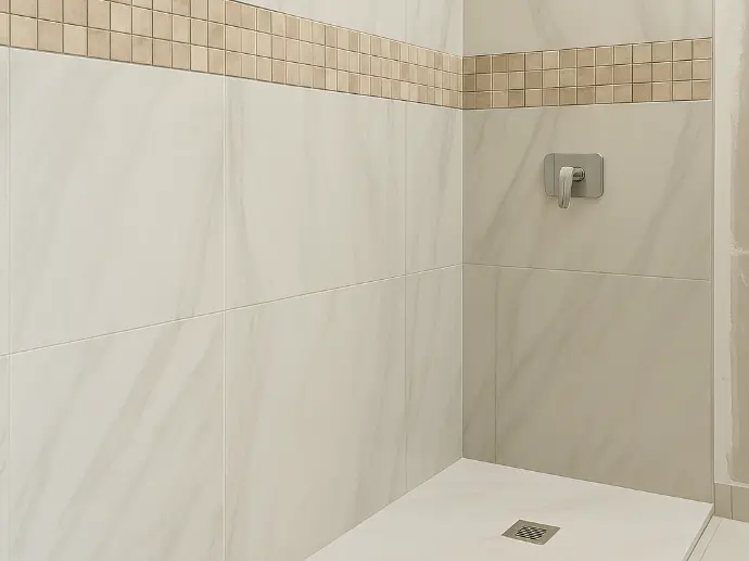 Sublimez votre salle de bain avec un carrelage effet marbre et une frise mosaïque élégante, alliant raffinement, modernité et finitions impeccables.
